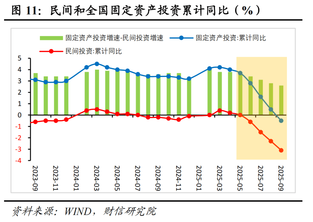 投资增速转负,政策宜加大稳投资力度。1-9月份固定资产投资同比下降0.5%,较1-8月放缓1.0个百分点(见图11),连续6个月回落,续创疫情封锁期外历史新低;8月份环比下降0.07%,连续8个月负增长,投资端动能持续走弱。其中民间投资增速降幅扩大0.8个百分点至-3.1%,对整体投资的拖累作用加深(见图11),民营企业“不敢投、不愿投”现象没有出现缓解,反内卷导致部分行业投资进入观望期、房地产市场持续低迷、出口下行预期增强等因素叠加,共同对民营企业投资能力和意愿形成压制。分结构看,1-9月份三大类投资增速再度全面放缓,有必要更好发挥政府投资的引领作用(见图12)。合计占全部投资比重近8成的制造业投资、基建投资和房地产投资,自今年3月份以来增速步入下行通道,且6-9月份回落加速,这一定程度上受到极端天气、价格低迷等短期因素的扰动,但根本原因在于前期政策效应减弱,以及反内卷政策和需求不足矛盾叠加,共同推升企业投资观望情绪,导致投资动能明显走弱。要打破当前投资负增长的局面,未来政策宜进一步发挥政府投资引领带动作用,有效提振市场主体需求与预期,推动投资动能回升。