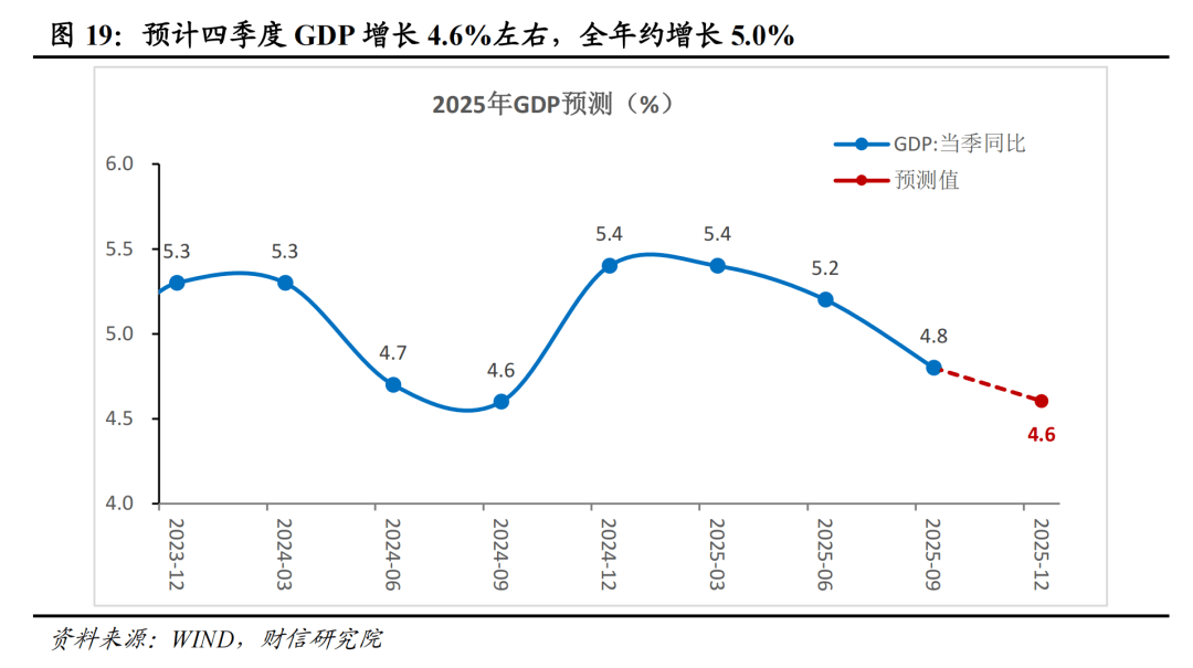 预计四季度经济增长面临几个约束:一是高基数的挑战。去年四季度GDP增速从4.6%跃升至5.4%,对今年四季度GDP增速构成较大挑战。二是关税政策的冲击扰动。暂停90天期间新增关税税率为30%,这一税率将延期至11月12日,预计拖累全年GDP增速缩减0.8个百分点左右,近期关税政策的不确定性明显增强,也对经济增长构成扰动。三是政策效力边际减弱的挑战。如以旧换新消费刺激政策效应可能已达峰,边际减弱的概率较大。四是出口增速的放缓。关税政策不确定性对出口构成冲击,还同时叠加高基数问题。五是房地产尚未止跌回稳,仍处于筑底阶段。但近期财政政策力度有所加大,如动用5000亿元地方政府债务结存限额追加资金额度,提前下达2026年新增地方政府债务限额,旨在巩固经济回升势头。综合上述因素,预计四季度GDP增长4.6%,全年增长5.0%左右(见图17)。