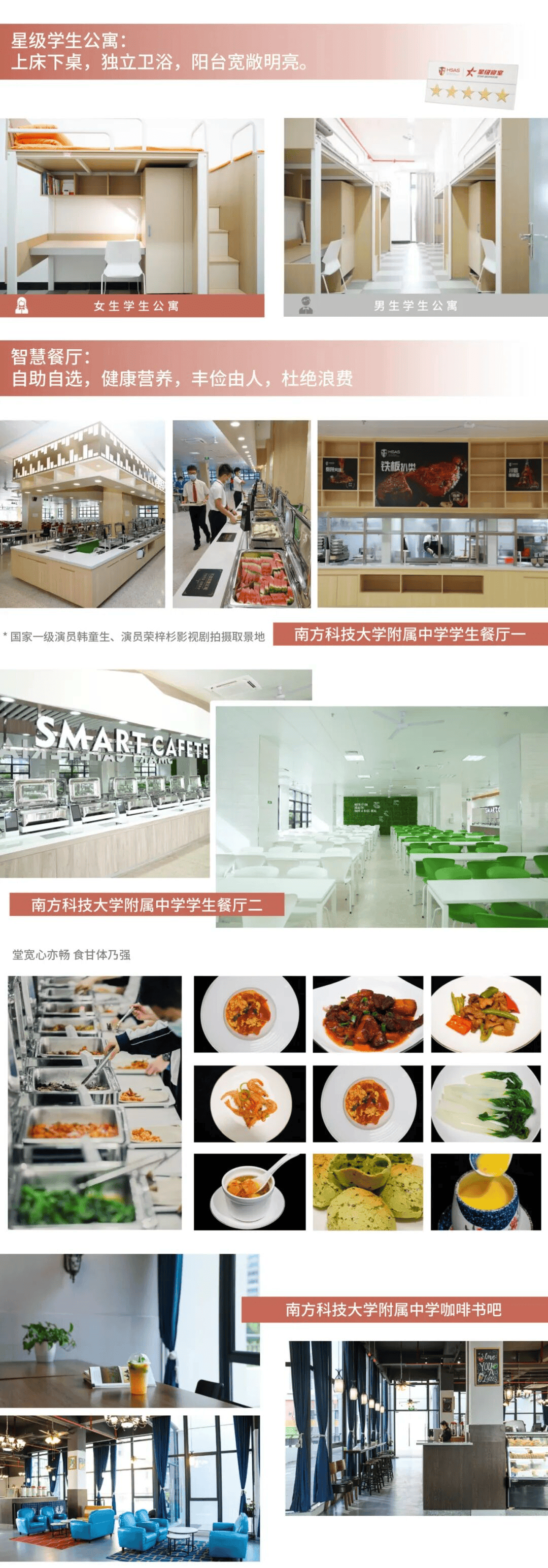最后值得关注的是,这里还有星级学生公寓,上床下桌,独立卫浴,阳台宽敞明亮;开设了2个智慧餐厅,可以自助自选,健康营养,丰俭由人;更有咖啡书吧供休闲娱乐。学校交通也十分便捷,南科大附中位于宝安区福海街道荔园路8号,地铁11号线可达,交通便利,毗邻全球最大的国际会展中心。