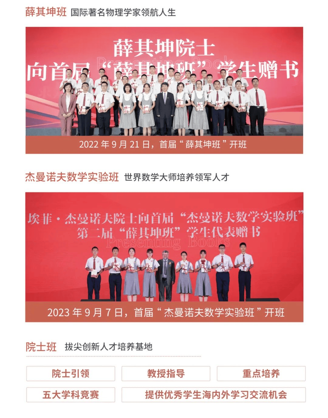 除此之外,学校还开创了杰曼诺夫数学实验班,吸纳在数学和信息学科上学习能力拔尖、学习兴趣浓厚的学生。杰曼诺夫是中国科学院外籍院士、美国科学院院士,他多次表达对培养学生成为拔尖创新人才的热爱。