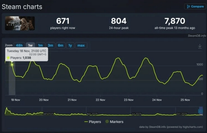 相比之下,《刺客信条:幻景》在 Steam 上的玩家峰值虽曾突破 7000,但仍远不及《影》、《英灵殿》、《奥德赛》或《起源》等作品。