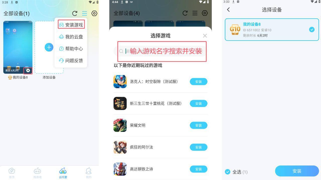 2、设置挂机任务:通过雷电圈在云手机安装《神宠大作战3》,打开游戏后设置自动挂机,想要多开可以通过【添加设备】后重复操作一遍。如果雷电圈内没有你想要的游戏,也可以通过上传云盘安装