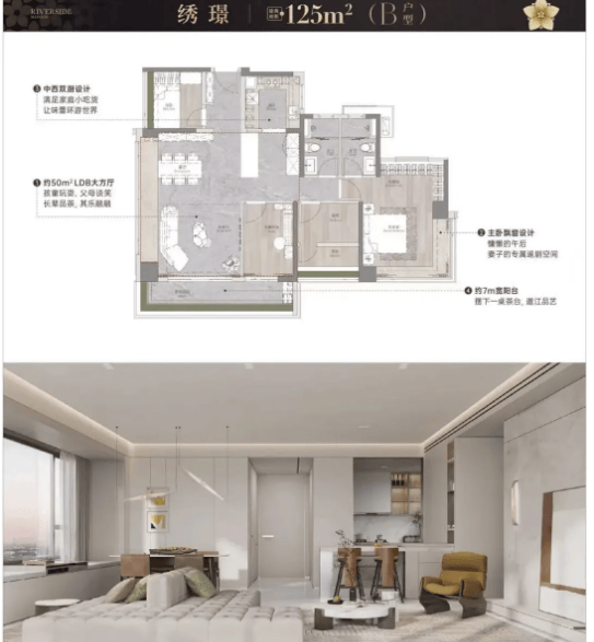 110㎡三房两厅两卫户型:该户型采用南向布局,全明通透设计,客厅与主卧均朝南,享受充足采光与温暖阳光。客厅连接观景阳台,推窗即可俯瞰一线江景与园林景观,拓展空间视野的同时,也让室内空气更流通。卧室均配备飘窗,增加使用空间的同时,也为业主提供了休闲观景的小天地。厨房采用U型布局,操作空间充足,动线合理,方便日常烹饪;卫生间干湿分离设计,保持室内干燥整洁,提升居住舒适度。该户型空间利用率高,布局紧凑合理,适合三口之家居住。