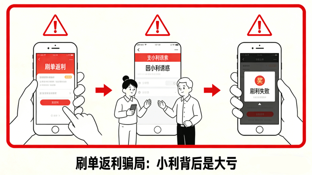 诈骗套路:春节假期不少人想“宅家赚外快”,骗子趁机在社交平台、微信群等发布“低投入、高回报”“简单刷单、日入数百”的虚假信息,以小额返利为诱饵,诱导用户先小额试单并快速返还返利,获取信任后,再要求用户进行大额转账,随后以“任务未完成”“需要充值解冻”等理由拒绝提现,甚至直接拉黑失联,导致用户血本无归!