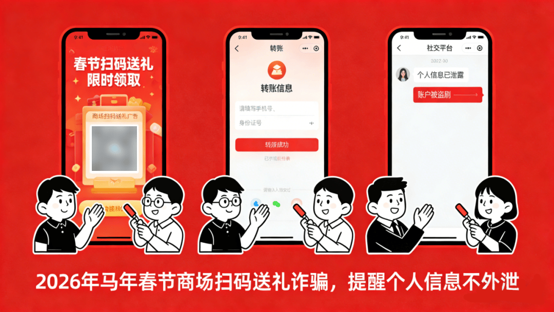 诈骗套路:春节期间,商场、购物中心、游园会等人流密集场所,常会出现各类“扫码送礼”活动,部分活动不仅要求扫描二维码,还需填写身份证号、手机号等个人信息。这些看似免费的“赠送”,可能是诈骗团伙精心包装的骗局,不法分子会利用获取的信息开通账号从事非法活动,让你不知不觉遭受损失!