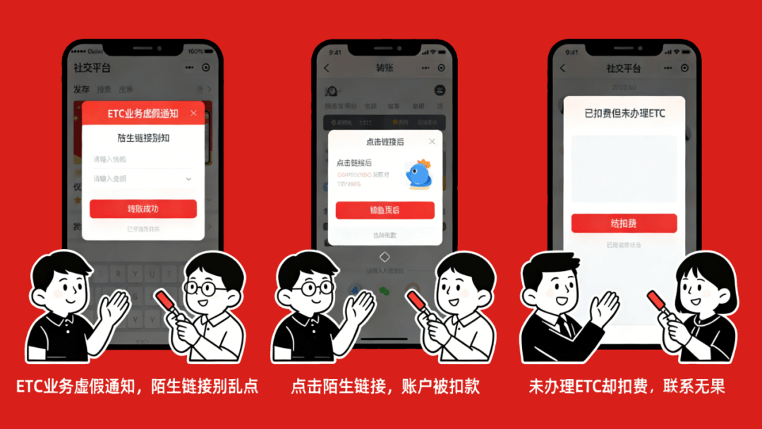 诈骗套路:骗子冒充ETC服务中心、高速公路管理部门等官方机构,发送“ETC账户已停用,需立即登录链接验证”的欺诈短信。短信中的链接是钓鱼网站,一旦点击并填写身份证号、银行卡信息、支付验证码等敏感内容,这些关键数据会被骗子实时窃取!