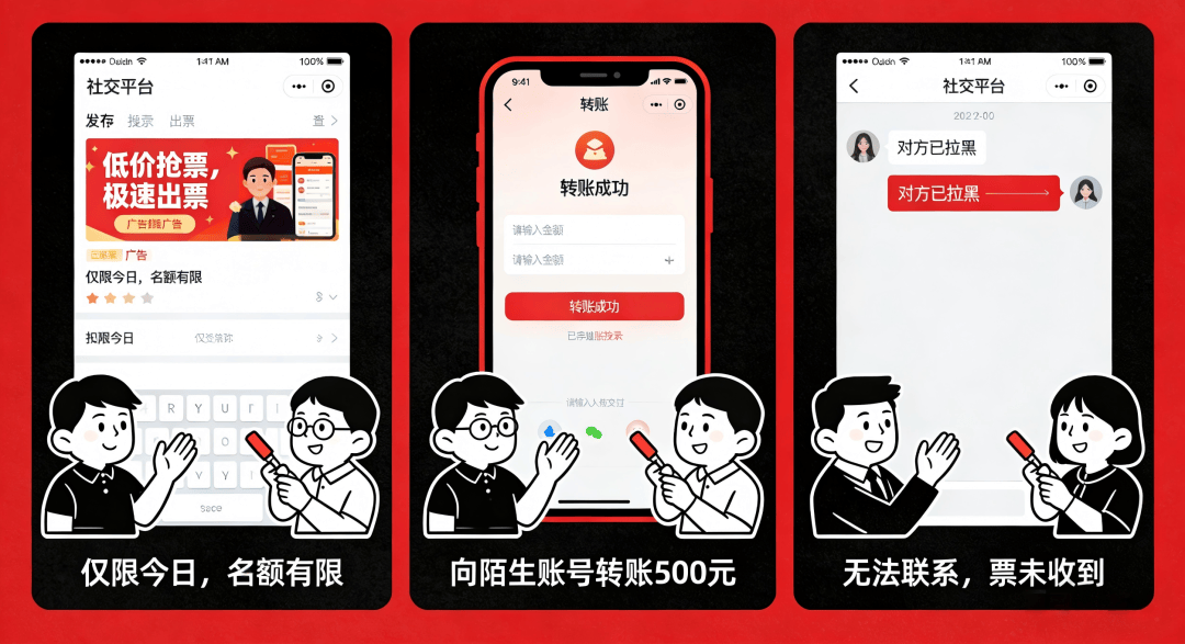 网络购票只在官方指定渠道操作,不信“支付失败需重新填写账户信息”等说法,一旦发现被骗,第一时间报警求助。