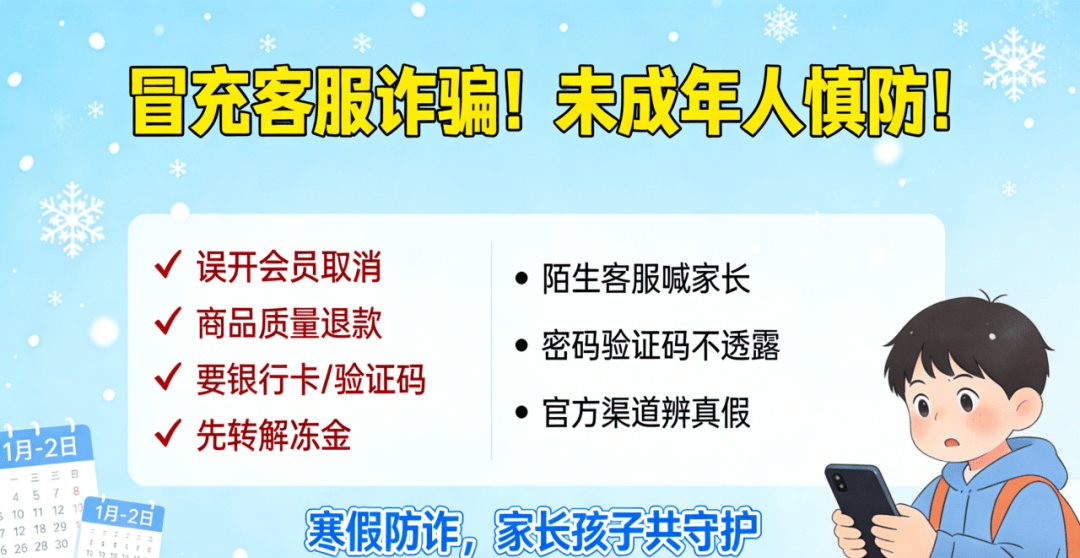 5 类诈骗套路不同,核心一致:套取验证码、银行卡密码,诱导转账。寒假期间,家长请做好孩子的防骗监护人,谨记两点:
