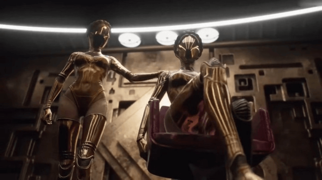 预告片结尾的彩蛋成为讨论焦点。《原子之心》中人气极高的双生机器人“双子”确认回归,并以全新形象登场。她们身披金色外装,造型更加华丽,细节设计明显升级,同时在预告中展现出不同于原作的舞姿演出,为作品增添了强烈的辨识度。