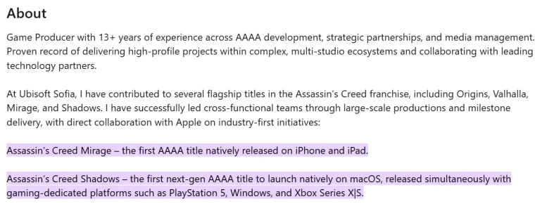 根据资料描述,《刺客信条:幻景》被称为“首款原生登陆iPhone与iPad的4A级游戏”,而《刺客信条:影》则被定义为“首款原生登陆macOS的次世代4A级游戏”。Yakovlieva曾负责《幻景》在iPhone 15 Pro以及搭载M1或更新芯片的iPad上的适配工作,并参与过多款《刺客信条》核心作品的开发,因此她的表述被不少玩家视为具有一定权威性。