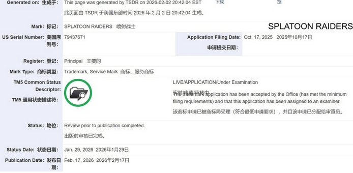不过,近日的一项商标信息更新或许暗示新动向即将到来。任天堂观察人士 Mike Odyssey 发现,《斯普拉遁:涂击队》的商标已于近期完成更新,且公告日期标注为2026年2月17日,距离当前时间仅剩约两周。