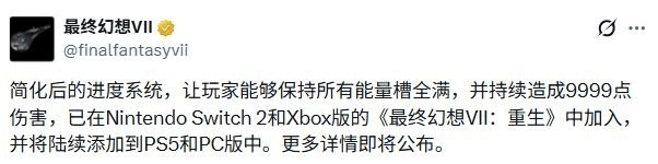 除了画面优化外,SE还计划为PC与PS5版本追加官方功能。该功能允许玩家在战斗中始终保持能量槽全满,并可持续打出9999点伤害。目前,这一选项已率先在Switch 2和Xbox版本中实装。未来更新完成后,各平台内容将基本保持一致。